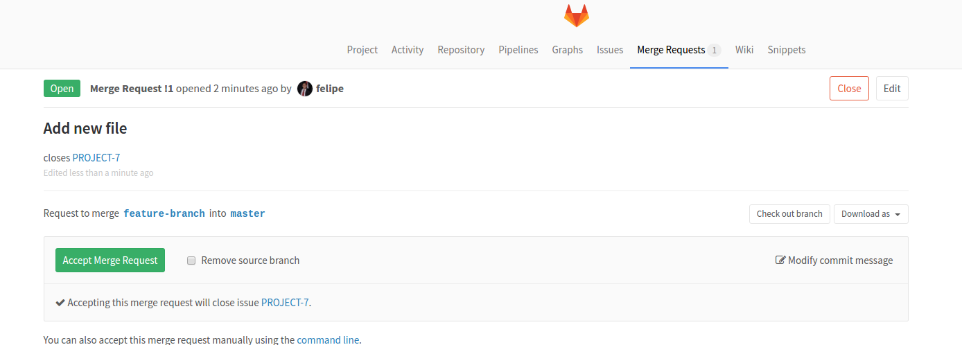 3. In the merge request description we use the issue closing trigger Closes PROJECT-7.